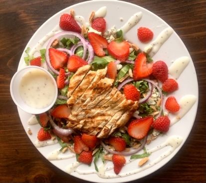 chicken, sundried cranberries, bleu cheesecrumbles and honey almonds. Served with warm breadstick and raspberry vinaigrette